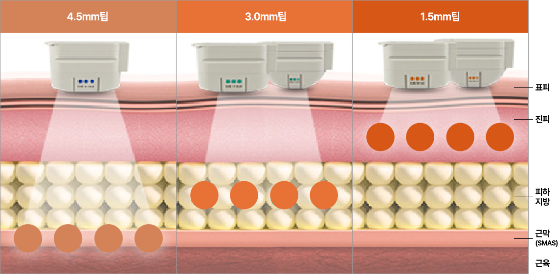 High-intensity energy from Ulthera, Thermage, Onda, etc. acts from shallow skin layers (dermis~fat layer) to deep layers (fat~SMAS fascia), targeting simultaneously.